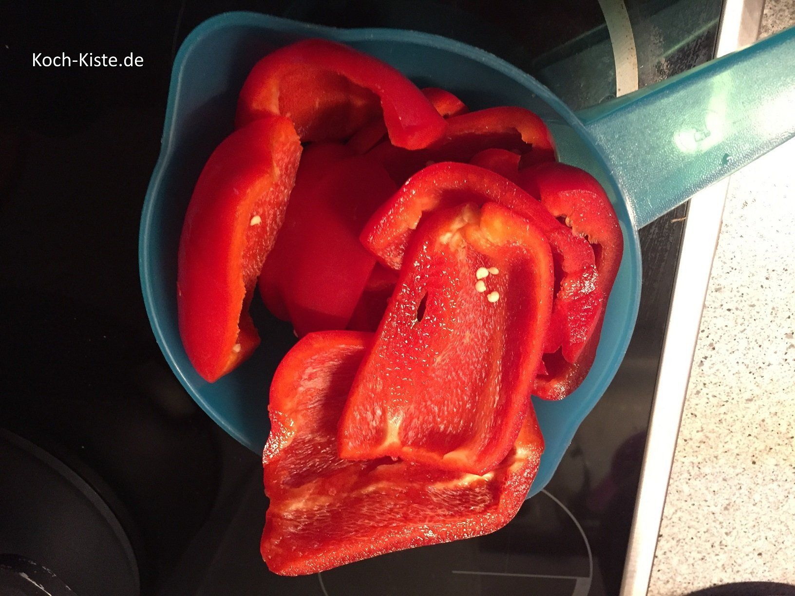 d) spüle die Paprika unter fließendem, kaltem Wasser ab, so dass die Kerne abgespült werden.