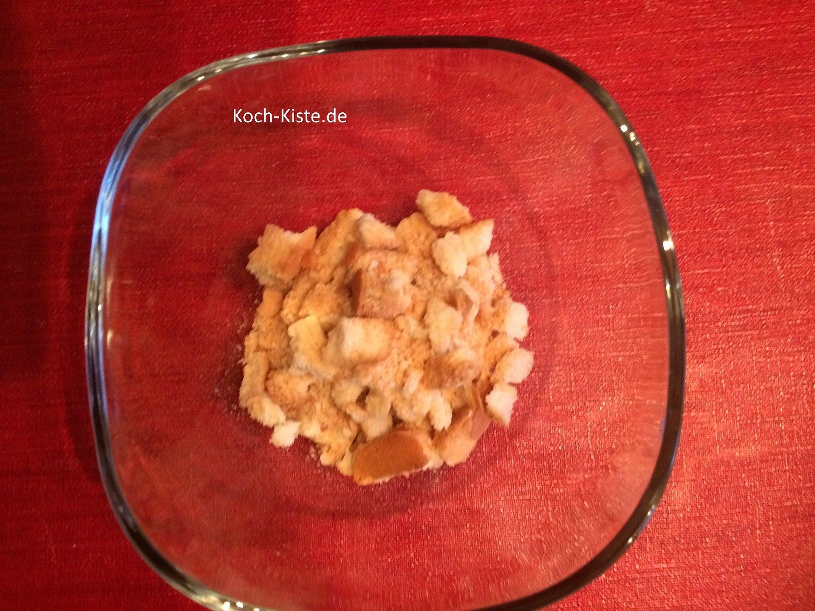 c) mit Hilfe einer Teigrolle zerdrückst Du den Zwieback, so dass kleine Brocken entstehen.