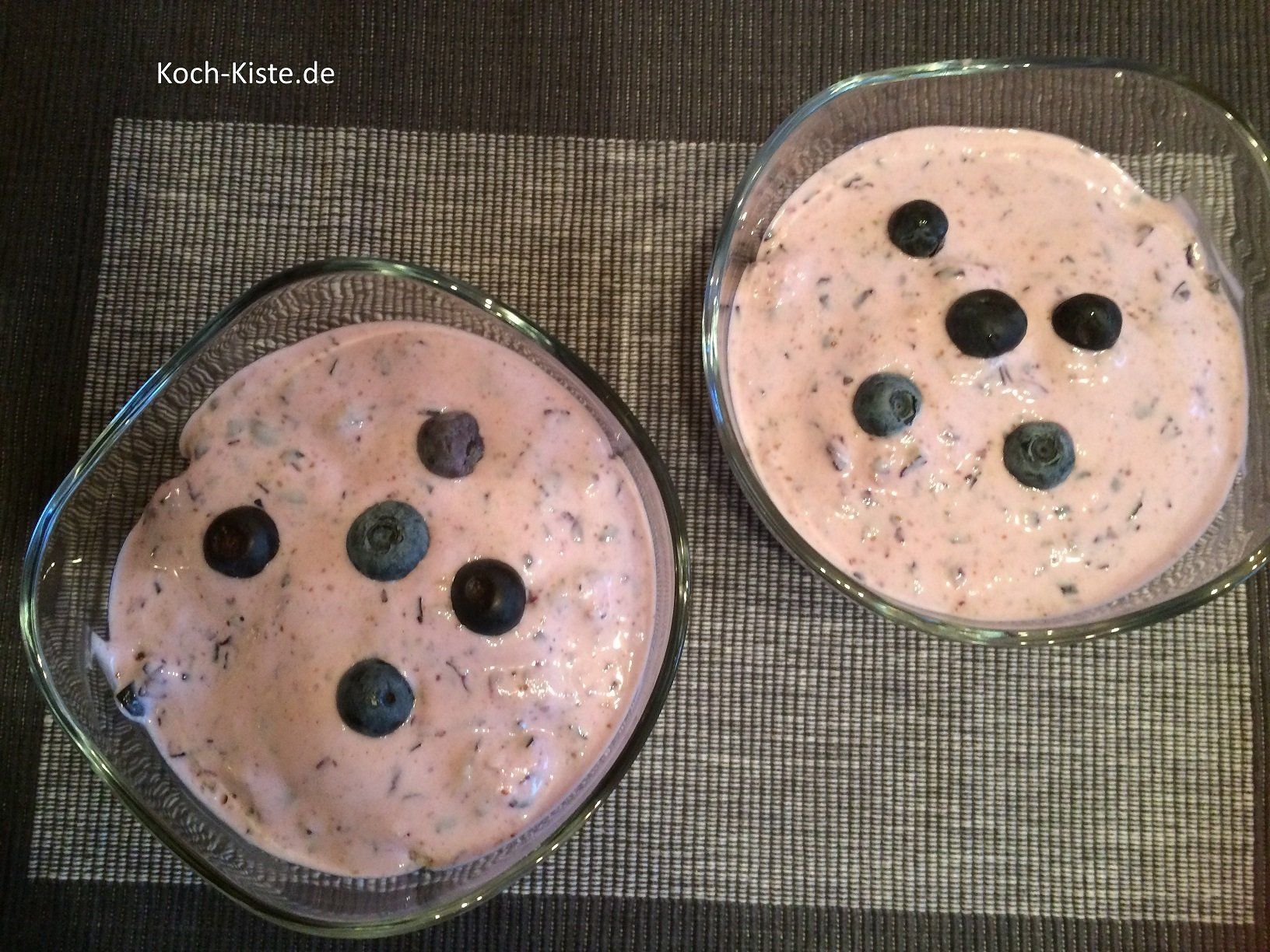 Stelle das Zwieback-Heidelbeer Dessert für mindestens 30 Minuten in den Kühlschrank.